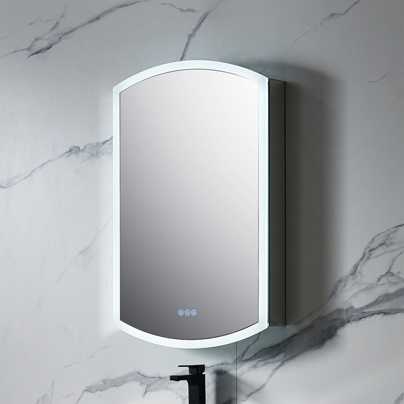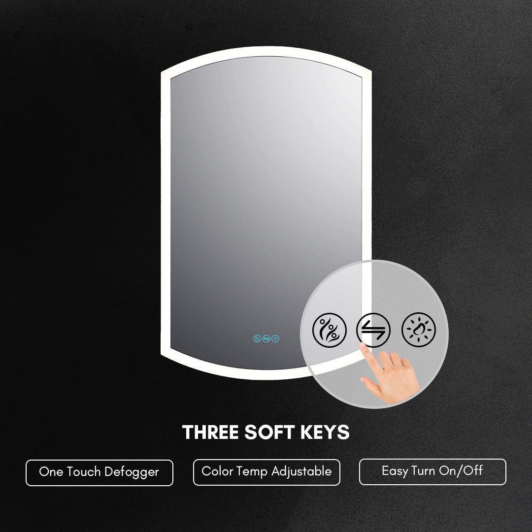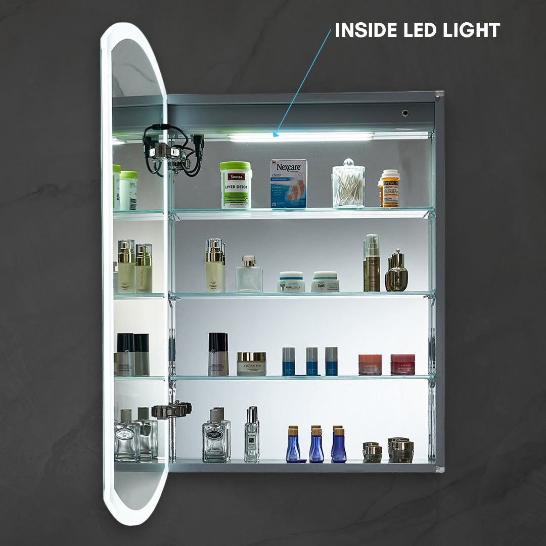 The 24-Inch LED Medicine Cabinet is a sleek, modern, and functional addition to any bathroom. Designed for both surface and recessed mounting, this cabinet is ETL Certified and IP44 rated, ensuring it is perfect for the damp bathroom environment. It features a premium anodized anti-corrosion aluminum frame with a scratch-free finish, along with a copper-free silver door front mirror that enhances durability and aesthetics. Inside, it boasts an adjustable CRI 90+ LED light source, which offers customizable brightness and color temperature, ensuring you get the perfect lighting for any task. The built-in defogger eliminates steam for a clear reflection and includes a convenient 45-60 minute auto-off feature. Additionally, the smart touch controls allow you to easily adjust settings and remember your preferred lighting, making the cabinet a truly user-friendly solution for everyday bathroom needs.