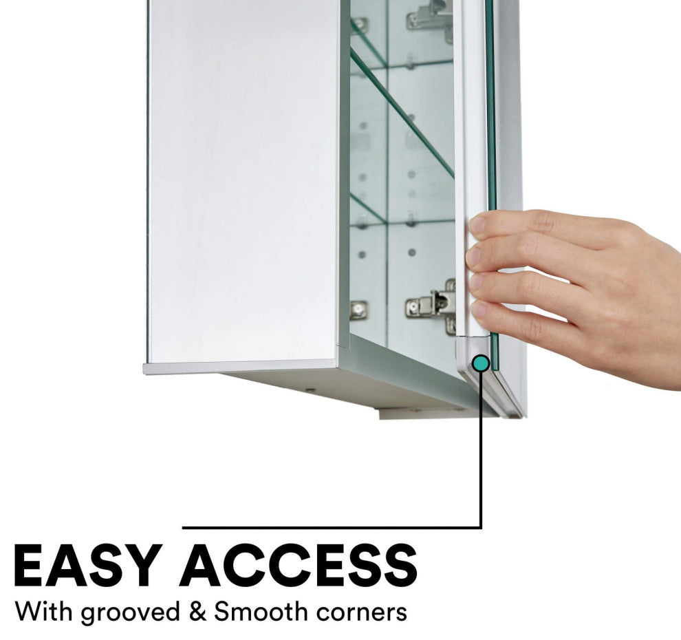 MIRROR MIRROR ON THE WALL: Mirrored front door, back door, and mirrored rear wall will add beauty and elegance to any bathroom or vanity decor. Mirrored sides provide superior visibility. Frameless pencil edge. Grooved all around for clean and easy access. Soft closing hinges at 180 degrees opening angle.